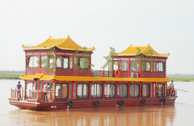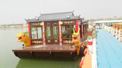 畫舫船就是裝飾古典華麗的游船,是"中國風"的仿古游船,結合古典園林建筑,體現了中華文明的古典藝術.畫舫船豪華而又古典,船上的建筑按照中國古代建筑里的亭臺樓閣,建筑工藝之復雜,要求之嚴格,仿古畫舫游船的特點飛檐翹角、玲瓏精致的四角亭子逐漸成形,赫然立于船頭,美人靠、盤龍柱子、彩畫……龍柱上的浮雕盤龍和祥云一層扣著一層,層層錯落有致,雕刻精細到盤龍身上的每一個鱗片都細細可數,古代皇家標志性元素,在畫舫船上體現的淋漓盡致。除了雕刻、花窗,整條船還有一個看點,那就是弧線優美、高高翹起的船尾。游船并不大,長約10米、寬3米,但是整體看起來堪稱一件藝術品。船尾的雕花欄桿與船艙、船頭的雕刻遙相呼應,船身四周貼著浮雕祥云,給整條船增添了富貴、華麗的氣質。